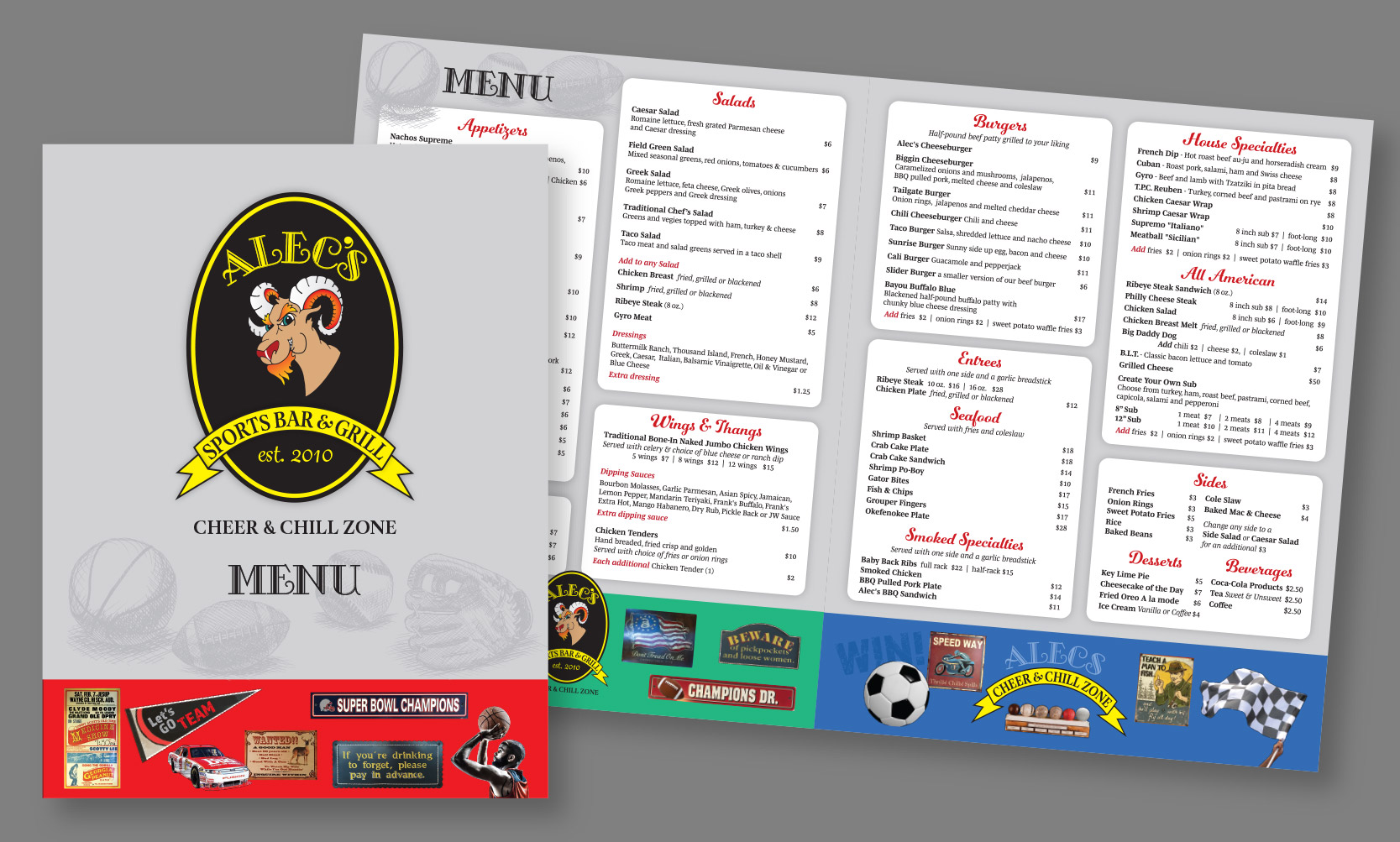 Alec's extensive menu needed to be easy to navigate while reflecting the ambiance of the bar and grill. The back provides a synopsis of the owner's expertise.