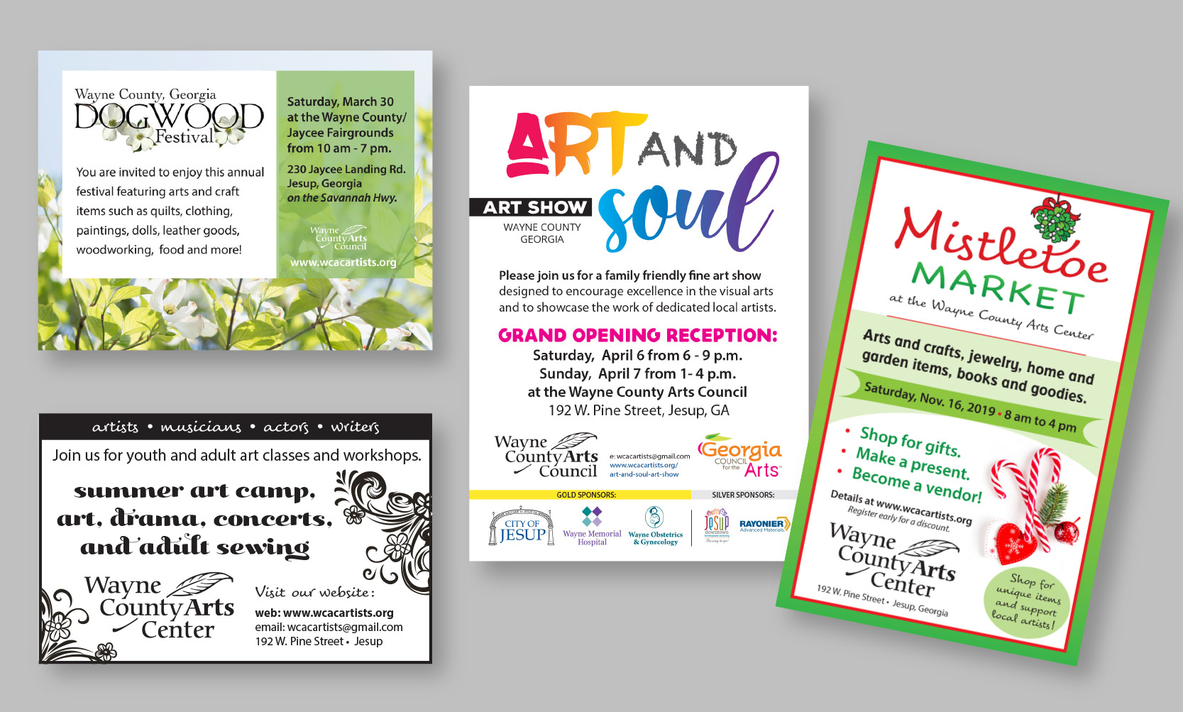 Posters, postcards, newspaper ads and flyers advertise community events for this nonprofit group supported by sponsors, members and participants.