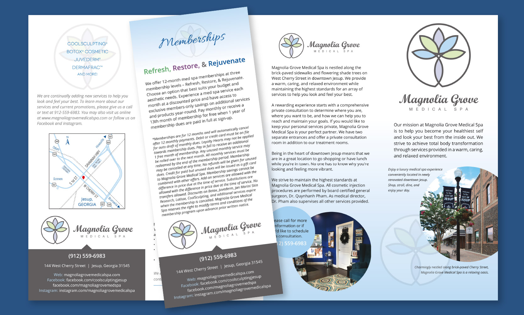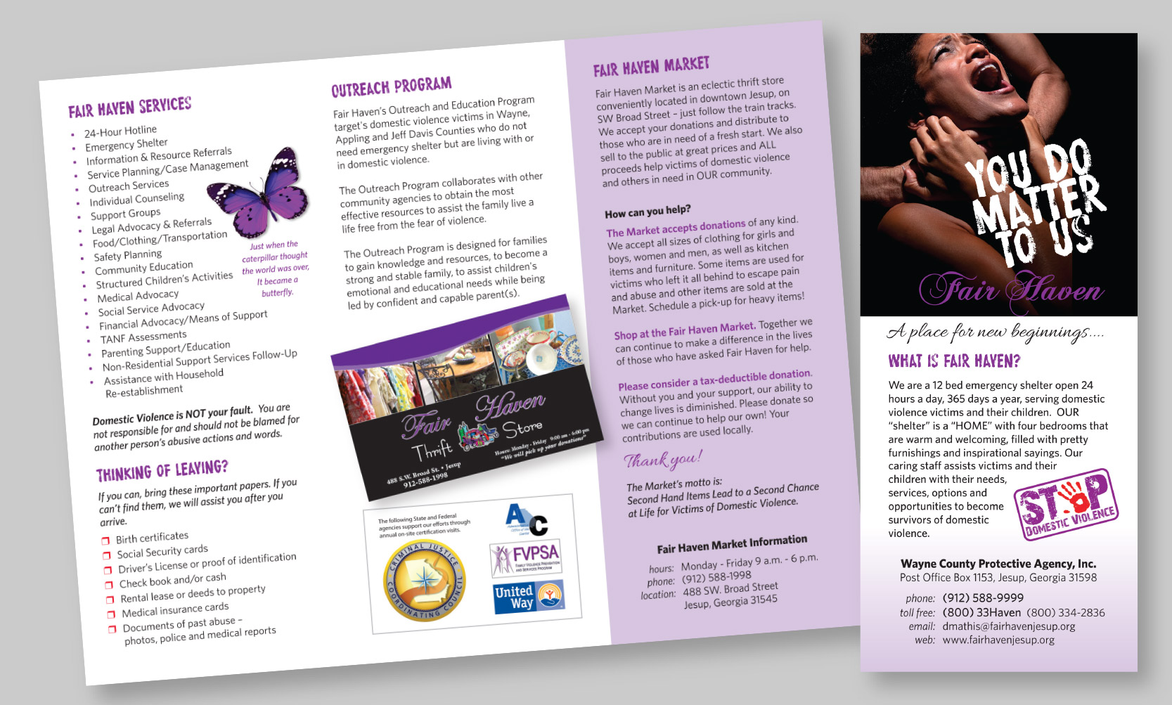 A four-panel glossy brochure and detailed insert are easily accessible to downtown shoppers. An attractive literature box is attached to the door at the main street location.