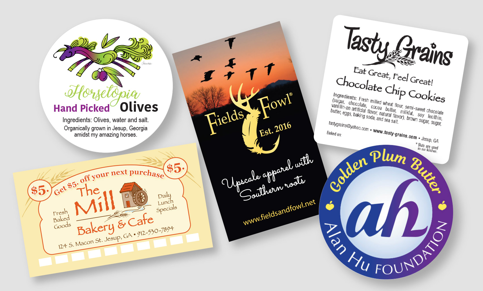 Art for adhesive labels and product tags is meticulously created to be printed on the right material for the job. Anything from weatherproof safety labels to clothing tags is available.